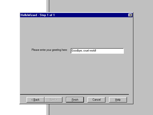 Believe it or not, this is it. The new HelloWizard is ready for use as soon as it is recompiled and installed in the MSDEV/TEMPLATE directory. You do not have to worry about installing it there yourself; it is done automatically as the last step of building the project.