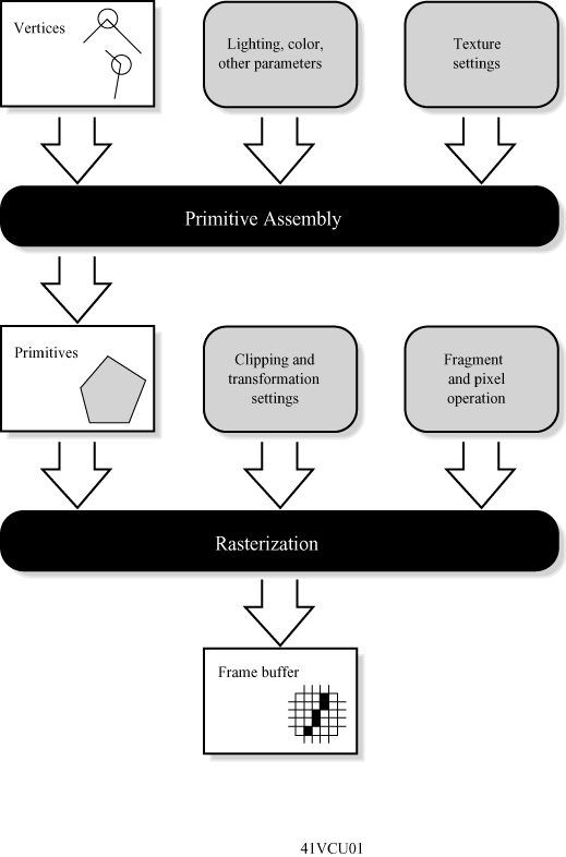 The OpenGL Library assembles primitives from vertices while taking into account a variety of settings, such as color, lighting, and texture. Primitives are then processed in accordance with transformations, clipping settings, and other parameters; at the end of the rasterization process is pixel data deposited into a frame buffer.