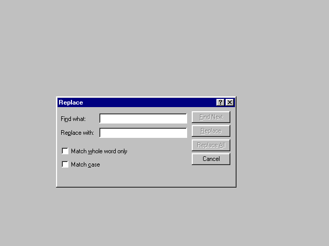 The Replace dialog (Figure 9.9) is a close cousin to the Find dialog and is initialized through an identical FINDREPLACE structure. This dialog is displayed in response to a call to the ReplaceText function.