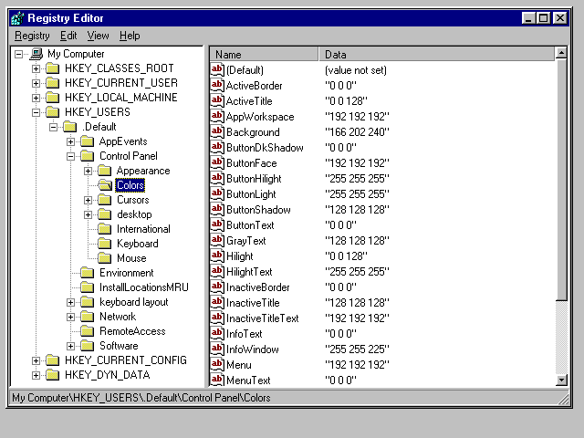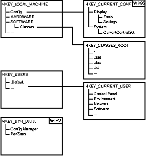 At the top level of the Registry are the root keys HKEY_USERS and HKEY_LOCAL_MACHINE. Other predefined keys include HKEY_CLASSES_ROOT, HKEY_CURRENT_USER, HKEY_CURRENT_CONFIG, and HKEY_DYN_DATA.