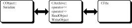 Serialization represents a relationship between objects derived from the CObject class, the CArchive class representing an archive, and the CFile class that represents physical storage (Figure 25.1).