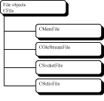 Variants of the CFile class include CStdioFile, CMemFile, COleStreamFile, and CSocketFile. These classes provide I/O functionality through C-style stream objects (FILE pointers), memory blocks, OLE IStream interfaces, and Windows sockets.