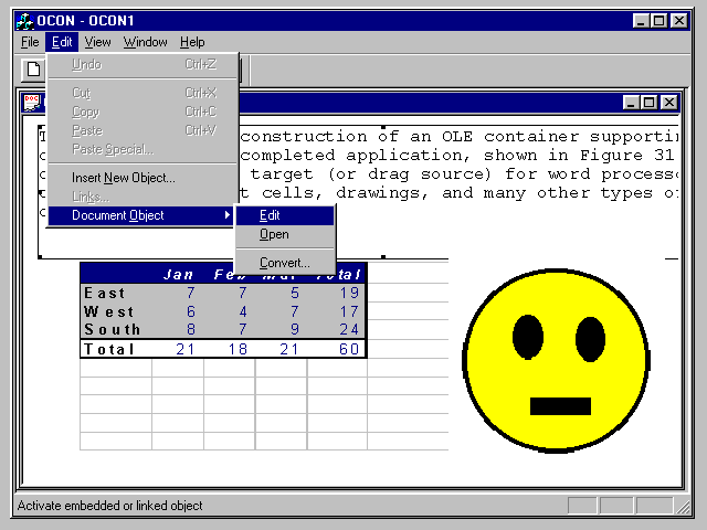 This concludes our construction of an OLE container supporting drag and drop. The completed application, shown in Figure 31.2, can serve as a drop target (or drag source) for word processor objects, spreadsheet cells, drawings, and many other types of OLE objects.