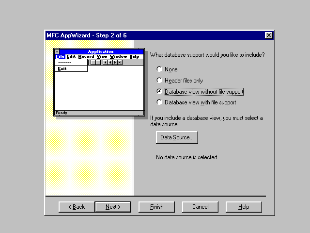 At this time, all dialogs should disappear except for the AppWizard Step 2 dialog; this dialog should now display our data source selection.