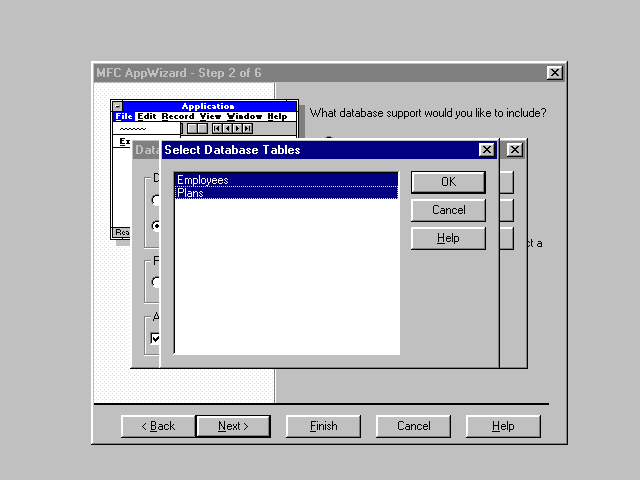 Clicking on the ellipsis button next to the DAO field enables you to specify the actual database file. It brings up a standard File Open dialog, where you can select the file adao.mdb. Select this file and when the Database Options dialog reappears, click the OK button. This should display another dialog where the tables of the database can be selected. Select both the Employees and the Plans table and click OK (Figure 34.9).