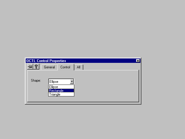 To demonstrate the capabilities of an OLE custom control, I developed a simple control. This control, OCTL, consists of a single button that can have three different shapes (ellipse, rectangle, triangle). When the control is clicked on, it changes its state from deselected to selected or vice versa. When the control is selected, it appears red; otherwise, its color is green. The control generates events whenever its state changes.