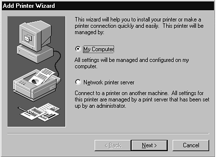 Next I want to go over the printer configuration process in a little more detail. One of the first things that hit me when reading articles on the Windows NT Internet newsgroup was the violent reaction some of the old-time NT administrators had to the use of wizards in the 4.0 version of NT. The main complaint was that they wanted to get things done quickly and that it took time to go through all of the panels in a wizard. These are probably people who are so familiar with the process that they could enter parameter settings on a DOS command line from memory. However, if you are not one of these gurus, then wizards can be a very friendly way to go through a configuration task, especially if you do not do this task every day.