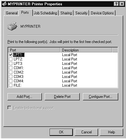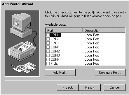 The next property page is ports used for locally-attached printers. Figure 8.11 shows this tab dialog. It looks very much like the wizard page and is pretty self explanatory. About the only thing that I could think of that would cause you to use this is if you want to switch ports say to locate your printer farther than traditional parallel port connections support and therefore you switch to a serial cable.