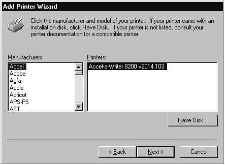 The next wizard screen you see allows you to specify the type of printer that you are connecting to and lets you scroll down through a list of manufacturers on the left side and select a particular model of printer made by that manufacturer. Windows NT supports a wide range of the more popular printers, but if you cannot find your printer on the list, you might be able to get a printer driver for Windows NT from the printer manufacturer. If this is the case, you would click the Have Disk button and tell NT where this driver is located (usually A: for your floppy disk drive). If you are using a printer drivers from the Windows NT CD-ROM, you should have this CD in the drive at this time. After you have selected your printer, you can click the Next button to go to the next panel. You should also note that there is a Back button at the bottom of all but the first screen in this wizard. This allows you go to the previous wizard panel if you realize that you made a mistake and need to change something.