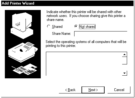 The next (and next to last) panel in this wizard lets you set up sharing for this printer. By default, a printer connected to your server will only be available to people who log on at the console. Now with everyone conscious about capital expenditures for computer equipment, the pressure is usually on to have people share printers that are located in convenient locations (or maybe in locations that are not so convenient). Sharing a printer is easy (see Fig. 8.9).