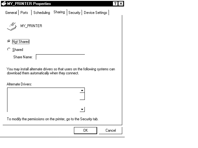The next tab dialog is another simple one (see Fig. 8.13). It just lets you determine whether you are going to share your printer with other users. If you choose to share the printer, you get to give it a text name that hopefully makes sense to the people who might be attaching to it. This just indicates that you are planning to share the printer. The next tab dialog will let you control who is allowed to access it.