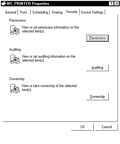 The next tab dialog allows your to control and monitor the use of your printers. (See Figure 8.14.) The concept of ownership may be foreign to some of you, especially if you do not use NTFS file systems. Basically, ownership allows a person to gain control of a set of resources under NT and be the one who must be contacted for access to those resources. This allows you to have someone in the department take ownership of the printer and coordinate access to it. Access can be granted to groups of individuals using the Permissions button on this tab dialog. Finally, you can set up auditing options to monitor usage of your printer using the Auditing button. All in all, a fairly complete set of controls for printer resources.
