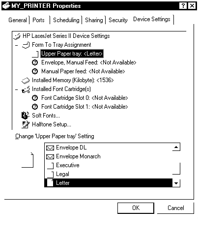 Every now and again, you will need to set up some of the fancier features of your printers (i.e. special trays for envelopes) or change some of the settings that you made (I have a printer with limited memory that I had to reduce the resolution down to 150 dots per inch to print graphics). Remember from the discussion around Figure 8.3 that you could call up property pages for an existing printer by right clicking on the icon for that printer and selecting the properties option (right clicking is another one of those new interface standards that you have to get used to). This property sheet contains six tabs that give you an amazing amount of control over your network printer.