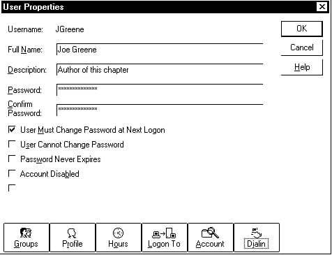 At the bottom of the User Properties page are important buttons with which you need to become familiar. These buttons access dialog boxes that enable you to set many of the other environmental parameters for the user's account.