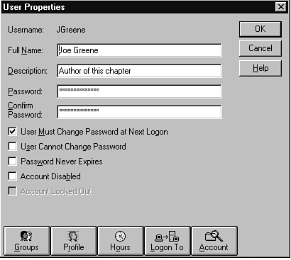 The next dialog box that you can access from the buttons at the bottom of the User Properties page controls certain parameters related to the user's account (see Figure 16.11). The first parameter controls when the user's account expires. This usually is implemented as a safeguard to prevent you from forgetting to disable the account of a contractor or permanent employee when they leave. I tend not to use this parameter, but there are some environments in which this parameter might be mandatory (such as access to a computer that requires a security clearance to be updated at regular intervals so that access is not denied). The other parameter enables you to specify whether this is a Global Account (which is the normal account that you create) or a local account for users from non-trusted domains.