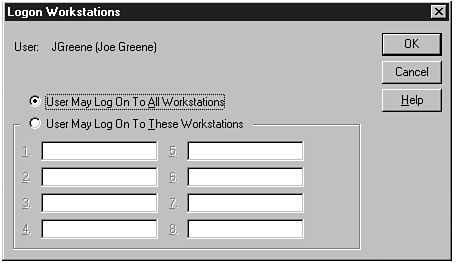 Another useful feature on the User Properties page is the capability to restrict workstations from which a particular user is allowed to log in. Figure 16.10 shows the basic data entry panel, which is a very simple interface. You can allow the user to log on from all workstations in the domain or you can specify the list of workstations from which the user can log on. This is helpful in operational environments where users should be at a specific console when performing certain critical tasks. You should ensure that people can log into enough workstations to ensure system access in the event of hardware or network failures.