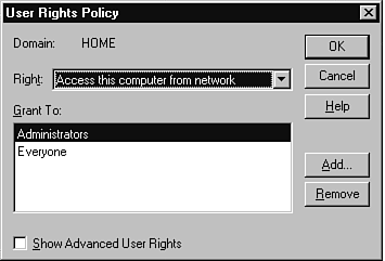 A closely related set of policies made by the system administrator are user rights. These focus primarily on what the user is allowed to do with the operating system. This is discussed in detail in the User Rights section, but for now you should have a feel for a few of the functions of the User Rights tool.