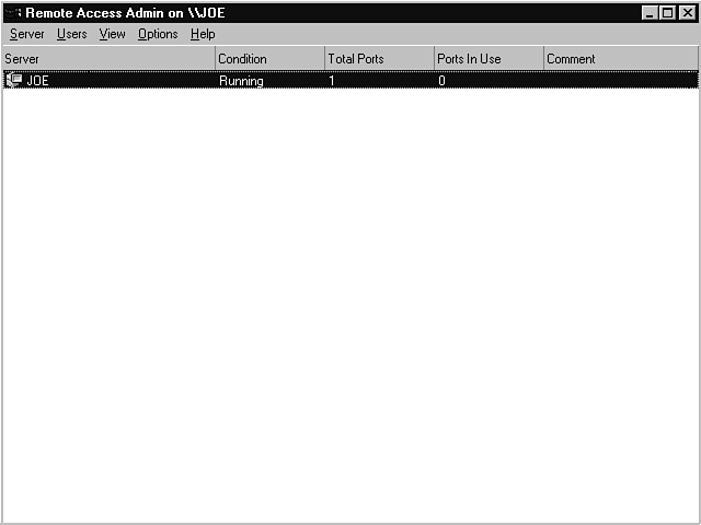 The first task you might want to accomplish is to start or stop the remote access service. Stopping and starting RAS might be necessary to run other communication packages that will not run as long as your modem is dedicated to listening for incoming calls to RAS. The stop and stop functions are located on the Server menu, along with a pause (which means don't take calls, but don't shut down the server or free up the modem). An interesting thing to note is that you can select the domain and server you are administrating when you are in a domain environment. This is another example of how Microsoft is integrating remote administration into their basic tools as opposed to building separate remote access tools. (Just wait until you see the next version of the operating system and applications which will integrate Web access).