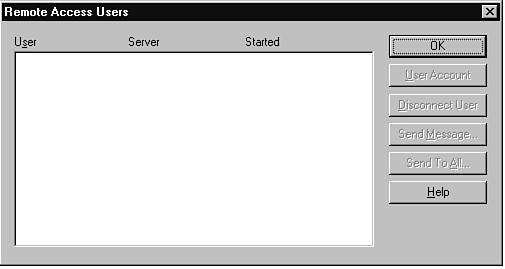 There is one final topic left in my RAS discussion. Suppose that you see the lights on your modem and know that someone has dialed in. How do you find out who it is that is logged in? The Active Users menu item on the Users menu shows you who is connected, to which server the user is connected, and when that user's connection started (see Figure 16.19). The buttons at the right of the display enable you to get more information on the user account, send that user a message, (such as "the system is going down in 10 minutes"), or even disconnect the user. Chapter 20 discussed RAS in more detail.