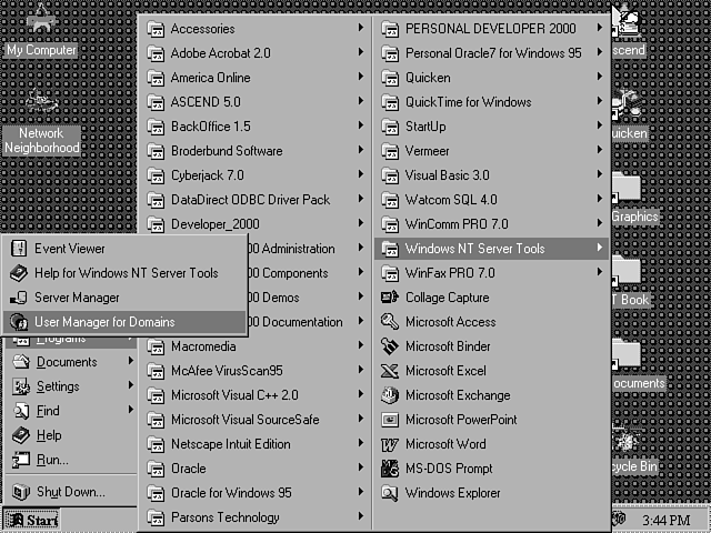 After you complete the installation, file configuration, and reboot, you are ready to use the remote administration tools. First ensure that your workstation is configured to participate in the domain on which you plan to administer. You can choose a domain after you start the tools. This is useful when you are working on multiple domains. I, however, prefer to have my default settings configured so that in the long run they minimize my labor. The first thing that you have to find is the location of the new software you installed. Figure 17.5 shows the location of the applications on my menu system.