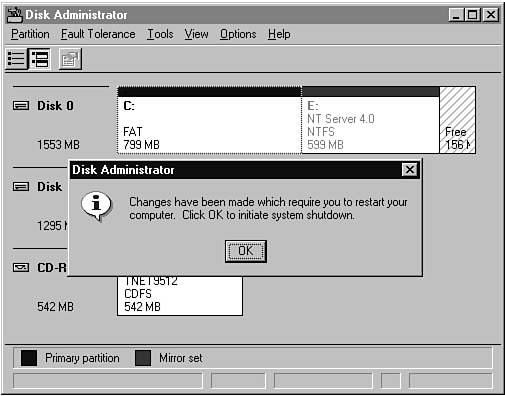 WARNING:When you make these changes, NT will require the system to restart when you exit Disk Administrator, as shown in Figure 23.3. This is not like other operations where you are given the option of restarting or not.