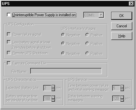 Although NT has built-in support for intelligent UPS devices, some makes and models of UPS devices actually come with their own software, which usually provides more robust services than the built-in UPS service. If your UPS comes with its own software for NT, you should probably use it, just contact the vendor to make sure it supports Windows NT 4.0.