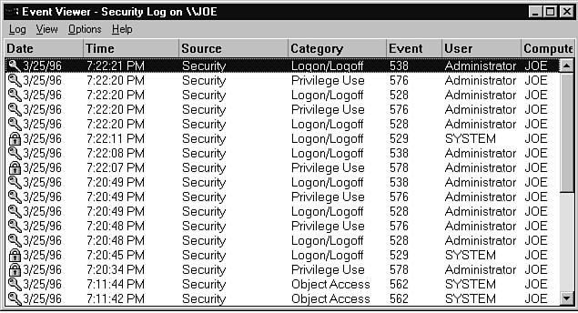 The two icons you typically see are a key (indicating success, which could be bad in the case of a hacker accessing something he shouldn't have) and a lock (indicating that the system stopped the user from doing something). It is normal to see a few failures every now and again (for example, I have so many passwords that I have trouble keeping them all straight). What you are really looking for is several failures occurring in a short period of time, which might indicate hacking. You can also scan through the Category list for events that are of interest to you (for example, logon/logoff events). Finally, the User column can help you zero in on the activities of a particular user that you might be keeping your eye on.