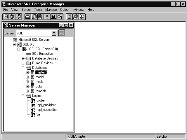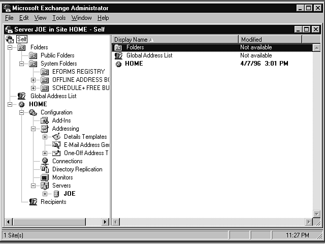 The administrator utility resembles many of the modern Microsoft Office products (and most of their other Windows 95 and Windows NT 4.0 applications). Figure 26.16 shows this interface. You start off with the traditional tree control on the left, which has a display on the right that displays the data that is appropriate for the items you have selected. There are a number of options available in the menu across the top, but most of the control functions can be accessed using the mouse and this tree control. You can select any number of servers to connect to (this is a multidocument interface application) and pick the parameters with which you want to work.