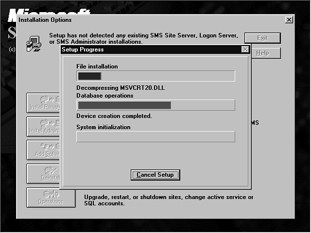 One final note that I just had to throw in here. Figure 26.20 shows the installation status panel from the SMS installation. You can see that it has multiple status indicators. Much like the winnt26.exe installation used for Windows NT itself, the installation procedure uses multiple threads running at the same time to accomplish the installation. In the SMS case, the file installation is going in parallel with database configuration work. I really like it anytime that people spend the time to make installation scripts an efficient use of the installers time and not just an afterthought done the day before the product goes to the production group.