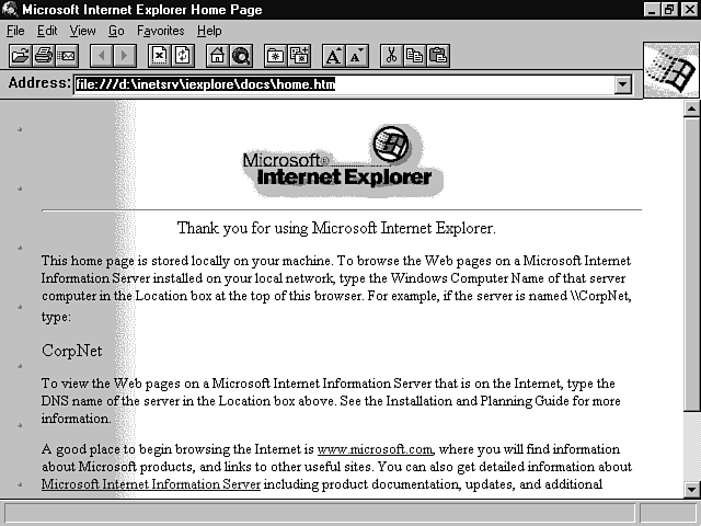 The World Wide Web server is probably the hottest feature on the Internet. I have even found a number of business people listing their Internet address on their business cards and stationary. The Web server is a repository of documents that are written in HTML and a background service that responds to requests for information in the format of a standard Web server. Early results have shown IIS to be a efficient and powerful server product. I like the fact that you do not have to drop a bundle on hardware to get yourself goinga fair sized NT server does just nicely. Figure 26.21 shows a sample Web page for those of you who have not yet surfed the Web.