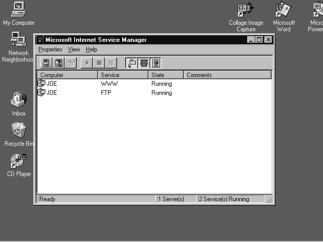 The Internet Information Server is controlled (started and stopped) by a relatively basic tool shown in Figure 26.22. In this case, I have only loaded the World Wide Web and FTP services (not gopher). You select which of the services that you want to control and then click the controls that resemble your standard CD or VCR controls (start, stop and pause). Unlike many of the other BackOffice component, IIS does not put a lot of load on your server until you have a lot of users accessing it (there is not a number of background processes that are running at all times or large memory areas allocated for processing). You will probably want to be sensitive most about the input/output loading on your server and split up files across multiple disk drives if you feel that you are going to run into heavy user loads.