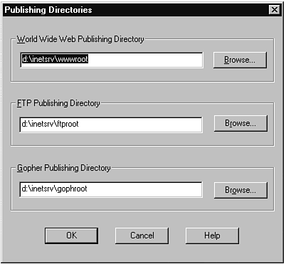 Figure 28.4 shows the next key screen in the IIS installation process. It is important for two reasons. First, you have to make sure that the disk drives on which you place this information have enough room to accommodate what might become a growing Internet server. Just as important are the security considerations for this directory. You need to make sure that this directory will not be used for proprietary or sensitive information by other users of your NT Server. If you are running an Intranet server, it might be perfectly acceptable to have anyone place information in this directory. If you allow outsiders access to your system from the Internet, however, it might be better to use the NTFS file system on the drive that contains these files (so that you have some security) and to allow only one or a few users to have write access to these directories (through their network share names). Either way, you really should plan (and document for management) the policies that are going to be implemented for update access to your Internet directories so that no one is surprised later.