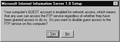 Figure 28.7 shows the final key screen in the IIS installation process for those installations with active network guest accounts. It is not a difficult question and it only has two answers (Yes or No). It does, however, open up a wealth of things that you have to think about relating to your server's security level. The guest account under Windows NT is the default account to let anyone log onto the server as long as they have the password (if there is a password) to this account. You have to be very conscious of which resources (printers, file share names, and so on) this guest account can access. I typically disable the guest account as part of installing a new server just because it makes me nervous, but there are environments in which this account is very useful (i.e. SQL Server installations). I tend to be nervous because it is a point where a hacker can enter the system and begin working out ways to penetrate system security. While thinking about security, ask yourself how many of your user accounts have passwords such as 12345, spouse names or abcde. There are hackers out there on the Internet who, if they know you have an employee named Jim Smith, will try all the common combinations and find that the logon is JSMITH, with a password of 12345. Hopefully, Jim does not have access to sensitive corporate information. The key here is to take a look at your user profiles that control security to ensure that your server is secure enough for the level of information you are storing on it.