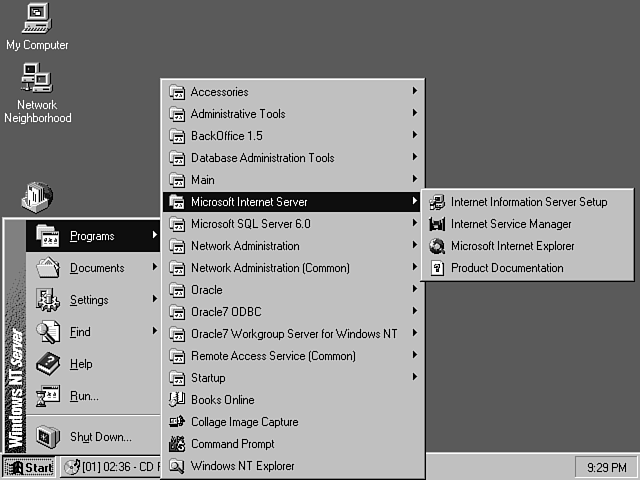 You might remember that you get an FTP service as part of the basic Windows NT networking package. The IIS FTP service replaces the basic NT FTP service to provide some additional control and tuning designed for a server accessible to the entire world. Another option on the Options menu that you might not connect immediately include the ODBC drivers (for Microsoft SQL Server). This feature enables you to connect your Web pages to the database and also enables you to log onto database tables instead of operating system files. Finally, you might want to use the Microsoft Internet Explorer tool, which enables you to access Web pages, FTP sites, and even newsgroups.