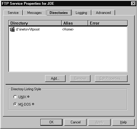 The Directories tab displays the directories set up to work with your Internet server (see Figure 28.12). When you ran Setup, you specified a single directory for each of the World Wide Web, Gopher, and FTP services. In a larger Internet site, you might want to have different directories for different groups of users. You might have one directory for marketing materials (open to the entire Internet), one for product technical literature (open to the Internet), and an internal one on production schedules, for example. You can set up different directories (along with aliases that users place after your domain name when they access the data) for this material to keep things a little more organized (and possibly more secure). You also have directory listing styles for DOS and UNIX. Depending on what your people are used to (DOS for internal PC users or UNIX for most external Internet users), you can set up the directory-naming conventions.