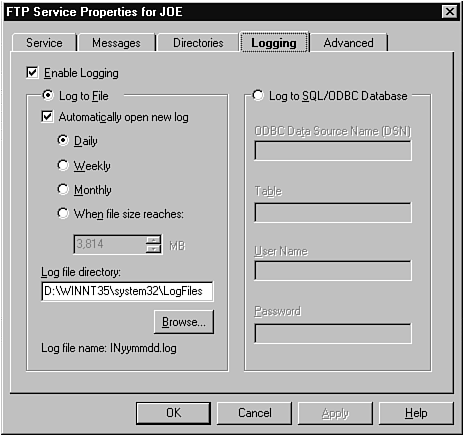 The Logging tab in the Services Manager controls the logs kept on your Internet server (see Figure 28.13). Some Web Masters (people who care and feed Web servers) believe in infinite freedom and do not care who gets at the information or how many people are using the site. They just publish because it is the right thing to do. If you are running a site marketing corporate information, however, your marketing staff might be concerned about the number of people reading their material. Also, you might have occasional problems, such as too many users trying to connect. You can monitor this by using the logging utilities built into the IIS. As with any log, you get into concerns as to where you put the data and how large you let it become before you purge it (I have found 50MB system log files on some systems that I have worked on that no one ever read). You use the Logging tab to manage these functions.