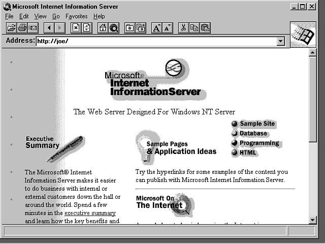 Now enter Microsoft. Because the Internet is becoming an important technology, Microsoft wants to have products to serve the growing needs of this marketplace. It started with its Explorer Web Browser a few months ago and has expanded its scope to include the server portion of the network with the Internet Information Server (IIS) product. This product, coupled tightly with the Windows NT operating system, has received some pretty good reviews. Even though its current version is only 1.0 (normally, 1.0 versions are something to avoid), it has shown both stability and speed. Current product announcements indicate that it will be bundled with NT in the future, making it effectively a part of the operating system. I therefore have chosen to use IIS as the example Internet server for the rest of this section.
