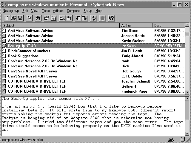 A sample newsgroup (the Windows NT newsgroup).